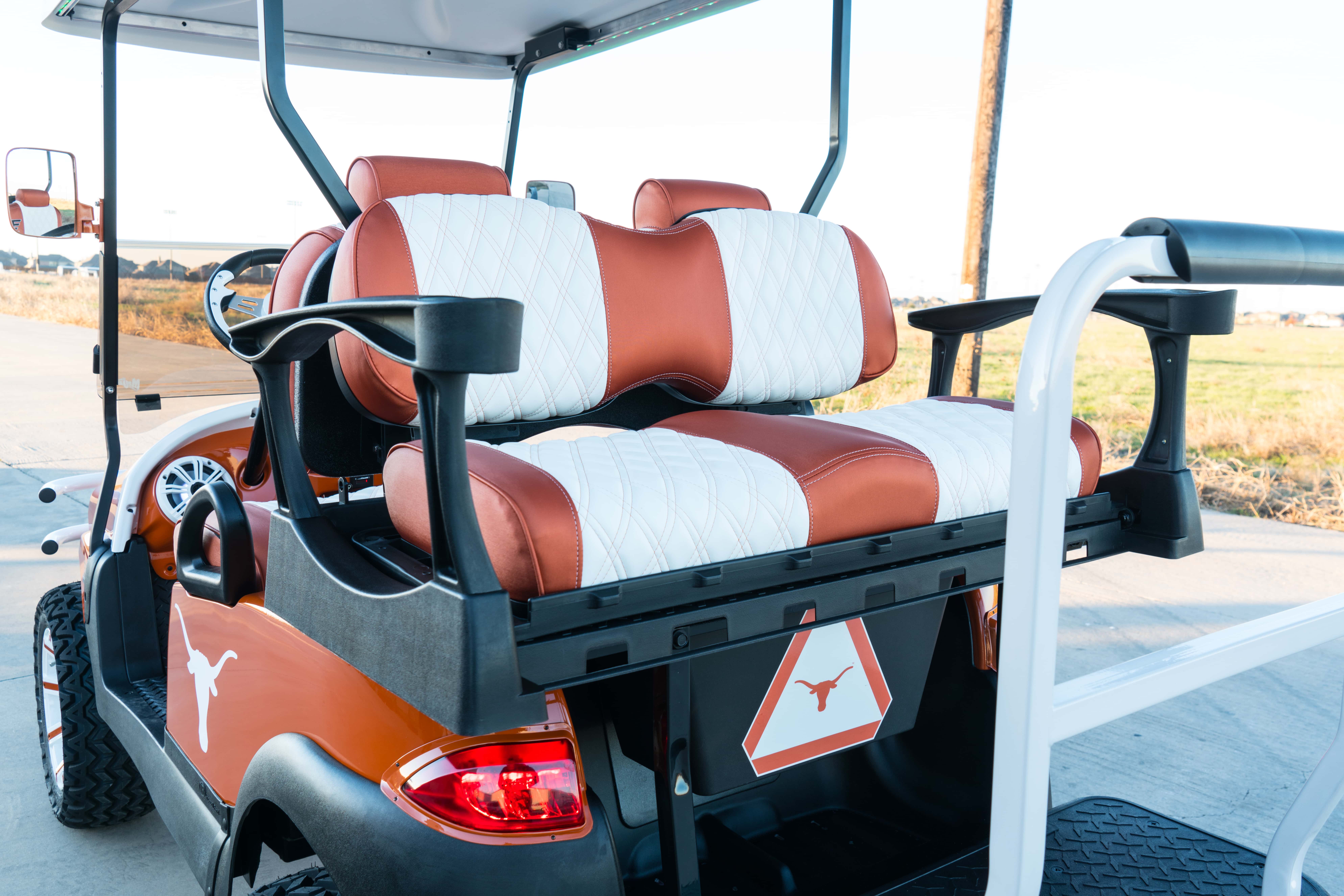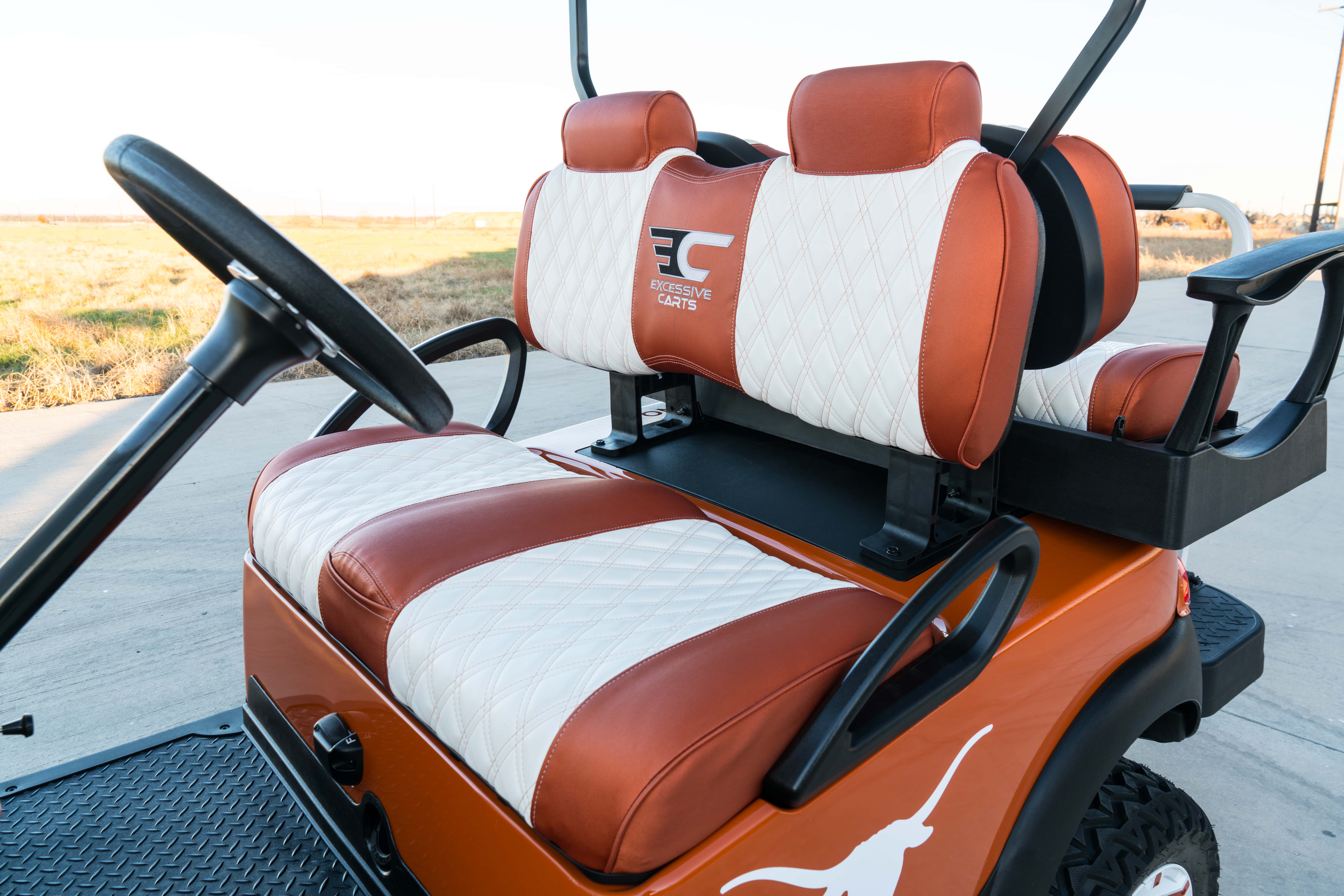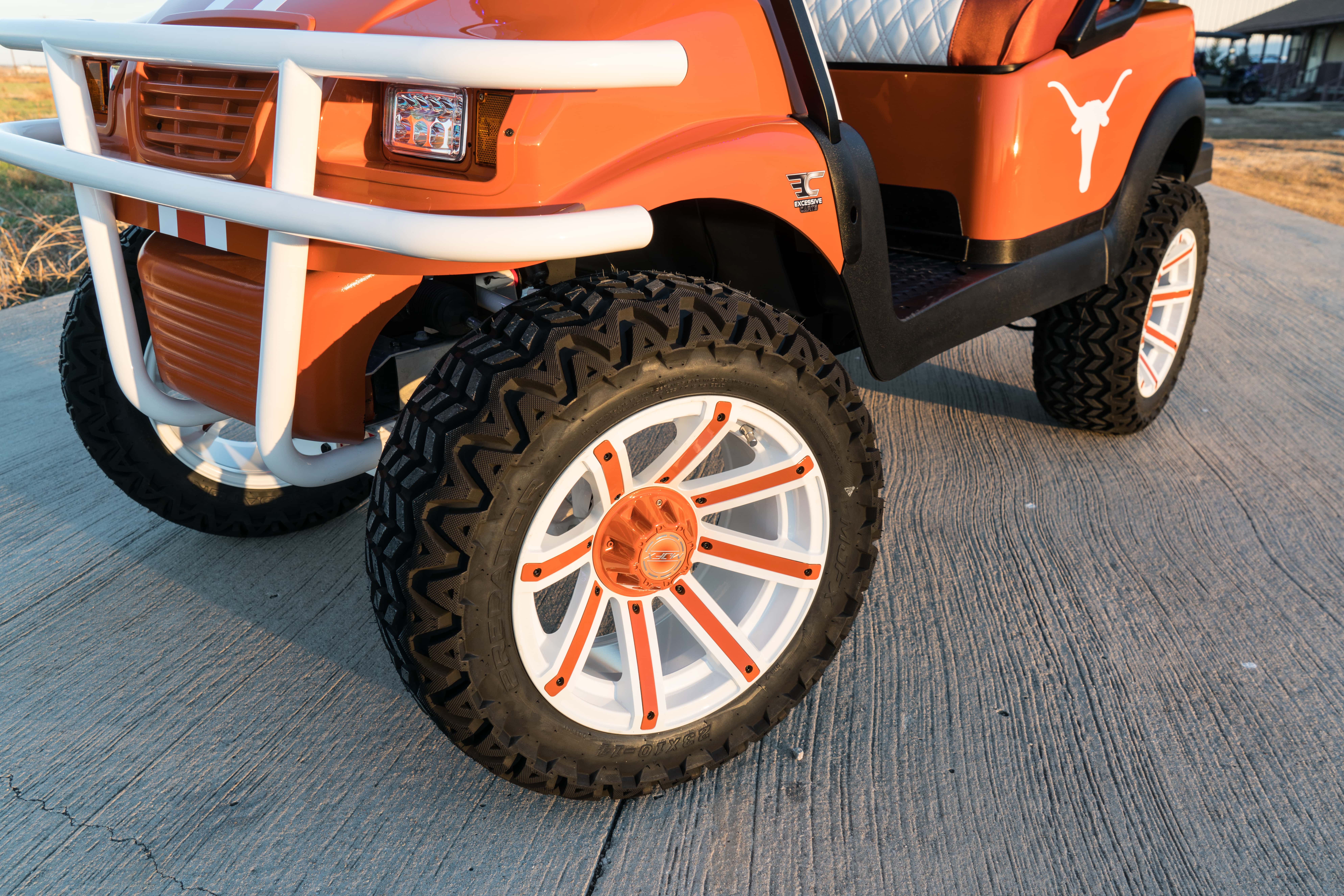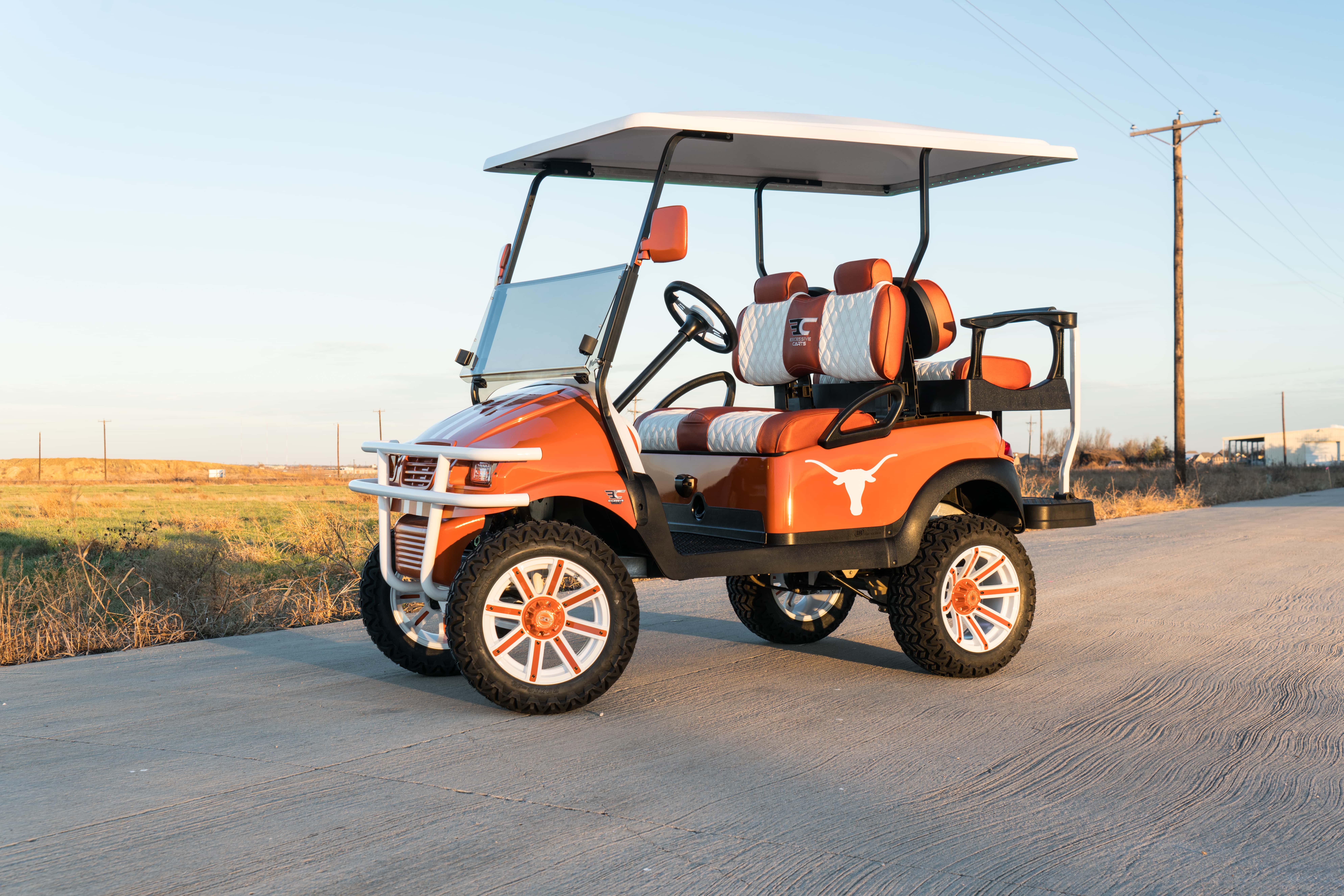Excessive Carts proudly highlights this 100% custom UT Longhorn Golf Cart. All of our builds start with a customer design consultation and end with a truly Excessive Cart experience! Your customization options insure no 2 UT Longhorn Golf Cart builds are ever the same. Our UT Longhorn golf cart build is truly one of a kind and, of course, Excessive!
